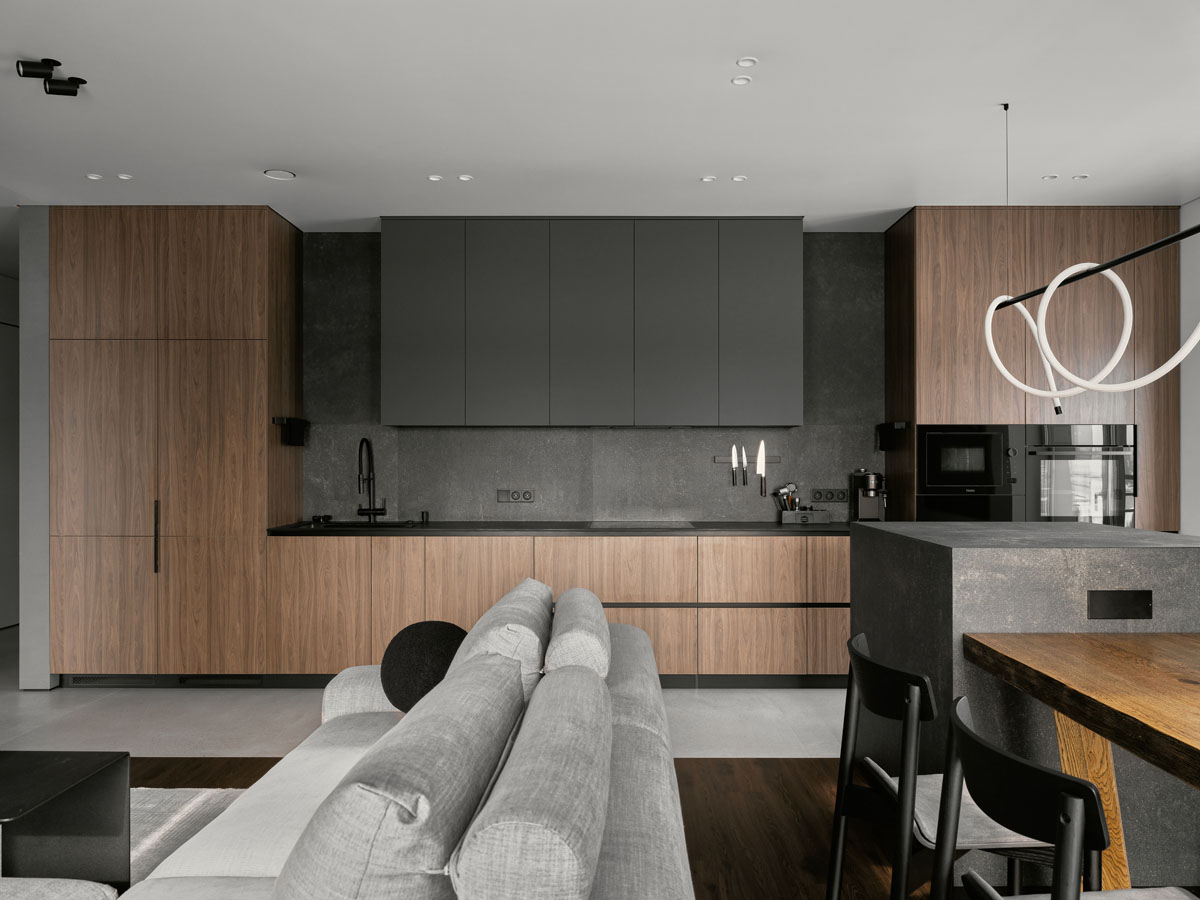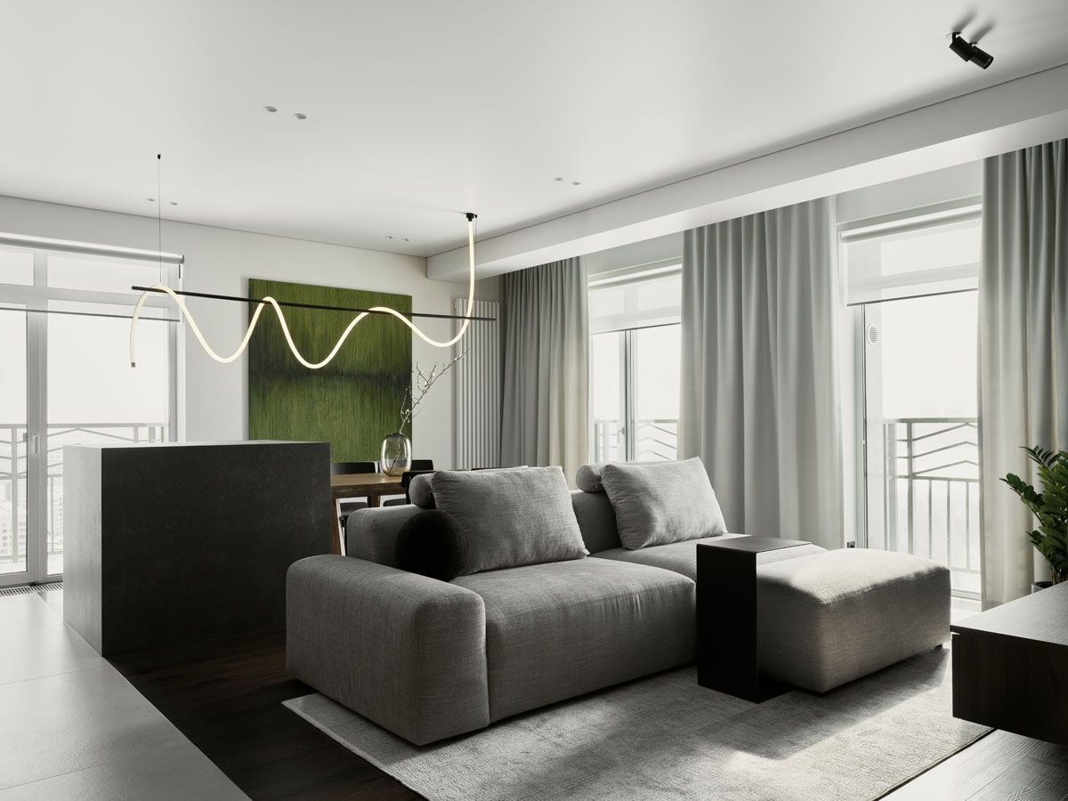 Для квартиры 97 м² с панорамным видом на Обь создали стильный и удобный интерьер по четкому запросу заказчика. В отделке объединили темное дерево, фактуру камня и природный зеленый цвет, на пол уложили практичный кварцевый ламинат Fargo.
